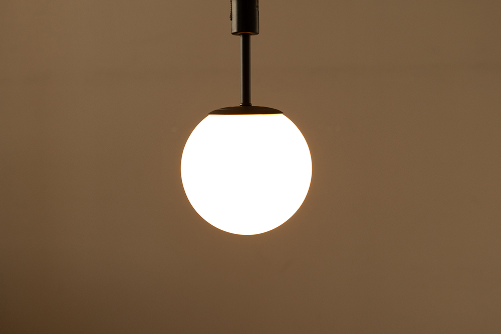 一般住宅の天井高に配慮したアイテムサイズと、長く使いたいと思えるスタンダードデザインのガラスボール照明。 全体的なバランスを維持する為に、小ぶりなガラスボールをセレクト。