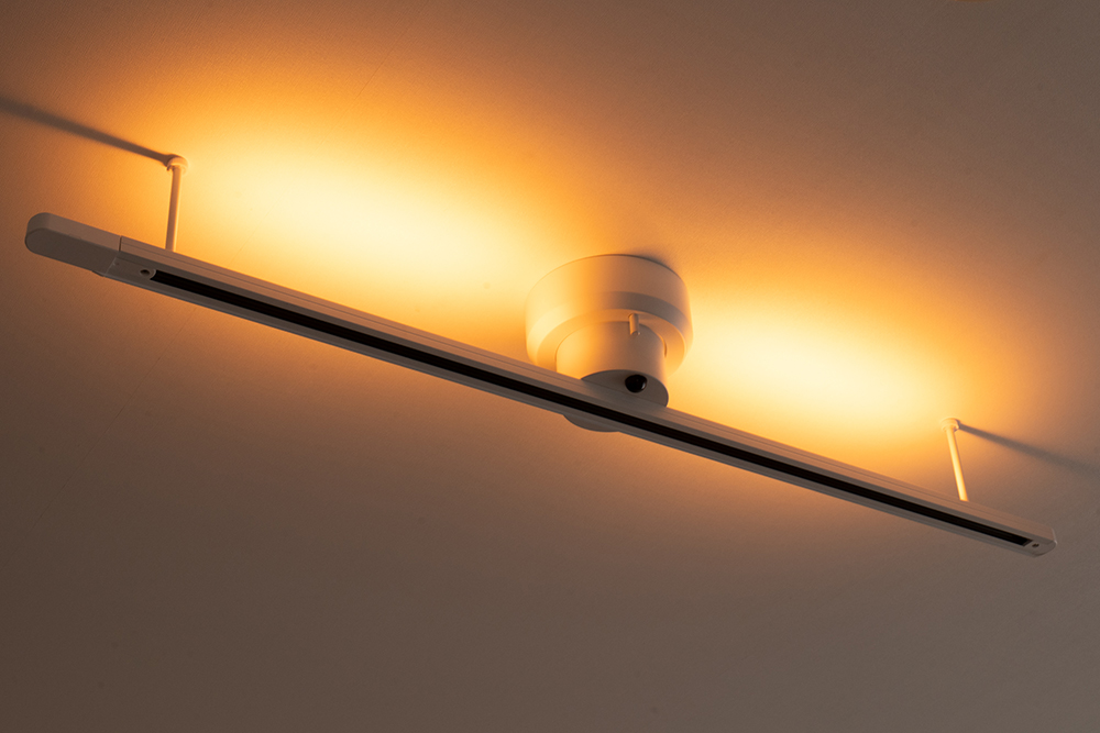 工事不要で簡単に取付られる照明用ダクトレール。レール上部のLED機能はそのままに、よりシンプルなデザインにすることで、既製品と比較して手にやすい価格のベーシックタイプのダクトレールです。上部のLEDは、レールに取付る照明の光源カラーに影響しないよう、昼白色(WH)から電球色(オレンジ)までの10段階の調色設定が可能。ダイニングやキッチンで小ぶりなペンダントライトを多投使いしたり空気を送るダクトレールファンを取付たりと、好みの空間を自在に作れます。